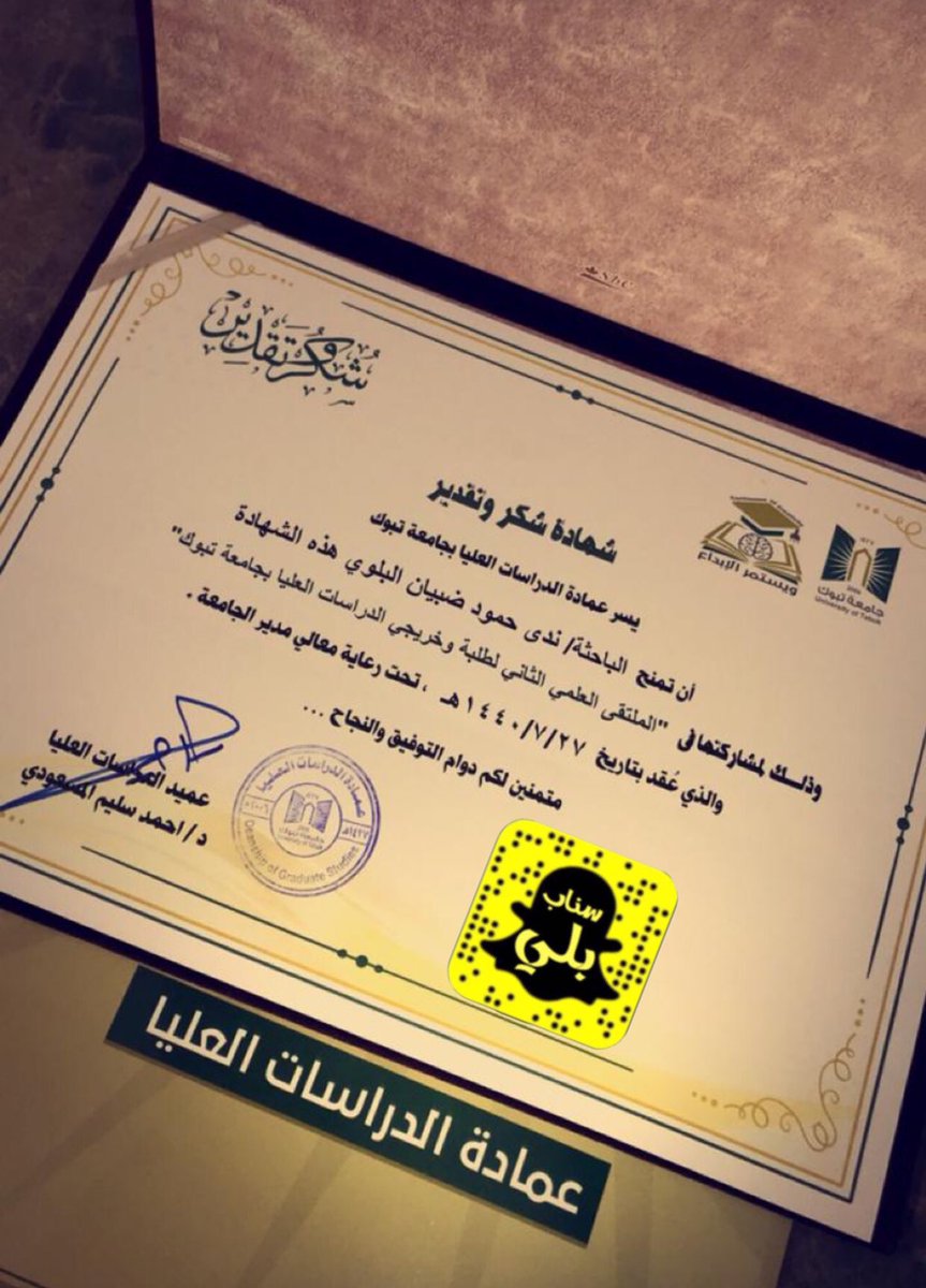 سناب بلي الرسمي Twitterissa تم تكريم الأستاذة ندى حمود ضبيان العصباني البلوي من قبل سعادة عميد الدراسات العليا بـ جامعة تبوك وذلك لـمشاركتها البحثية المتميزة فئة حملة الماجستير في الملتقى العلمي