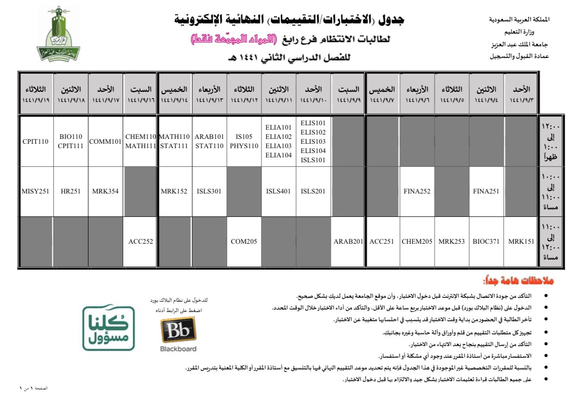 عمادة القبول والتسجيل Kau On Twitter جداول التقييمات الإختبارات الإلكترونية النهائية للفصل الدراسي الثاني 1440 1441هـ الانتظام طالبات جامعة الملك عبدالعزيز فرع رابغ Https T Co Go5bdnrapb